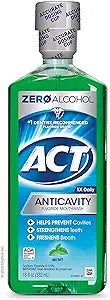Start ACTing to help prevent cavities, strengthen teeth and freshen breath. ACT Anticavity Zero Alcohol Fluoride Mouthwash is a once-daily mouth rinse formulated to help improve your oral hygiene routine. This ACT Mouthwash contains the maximum strength of fluoride available in rinse form without a prescription and is shown to help prevent tooth decay. ACT Anticavity Mouthwash Without Alcohol comes with an accurate dosing cup to give you the right amount of mouthwash with each use. When it comes to happy smiles, trust the No. 1 dentist recommended fluoride brand.