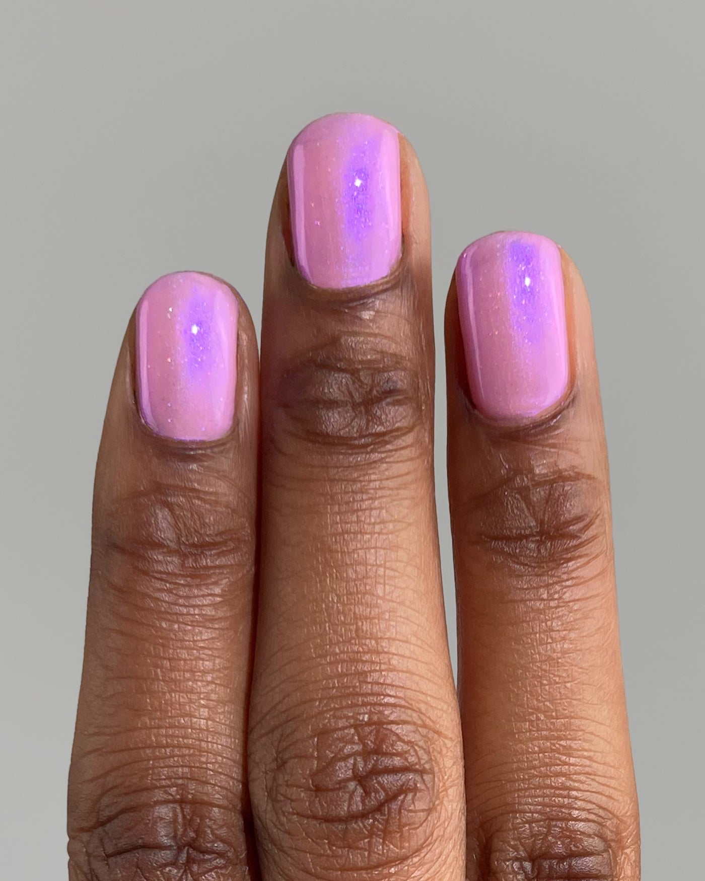 straight from the heavens, it’s a universally swoon-worthy shade. the type of beauty that’s been known to start a war. uncap this romance-inducing tincture and you’ll quickly feel something new...confusing…exciting, as this sultry sheer pink lacquer comes alive with an electrifying wave of intense purple shimmer and a demure dash of micro holo glitter.APHRODISIAC is a sheer pink lacquer filled with purple shimmer and micro holographic glitter that looks most divine in the sun. from the GODDESS COMPLEX SET.