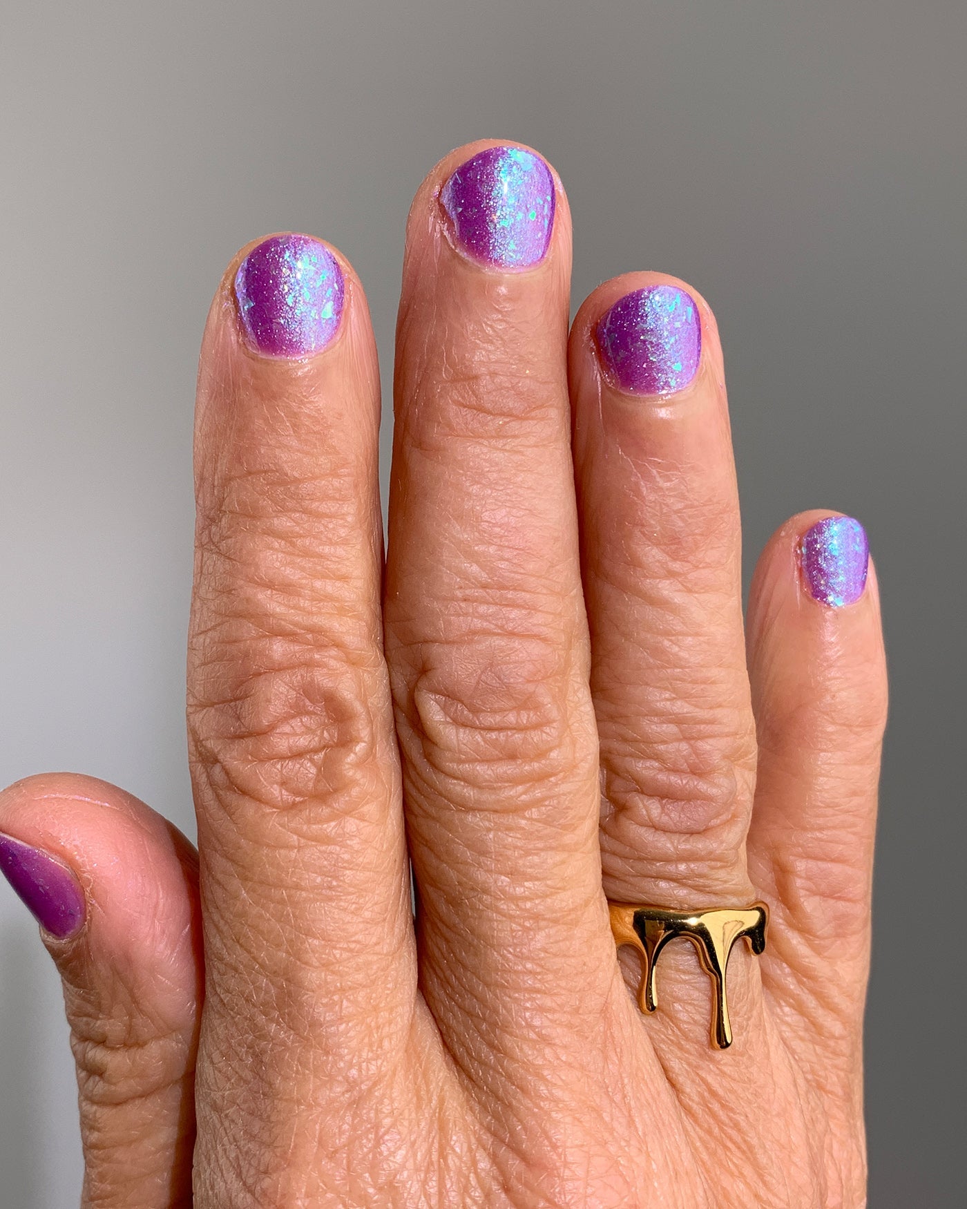 all who enter this stormy purple haze are subject to get lost in its captivating beauty. should you choose to brave these mysterious purple waters nonetheless, don’t be surprised as your claws gradually begin to disappear behind a sudden, disorienting fog of cold, glimmering green shimmer, glowing green flakies, and hypnotizing pops of super micro holo glitter.BERMUDA TRIANGLE is a purple jelly lacquer filled with green iridescent flakies and super micro holographic glitter. from the MERMAID TALES SET.