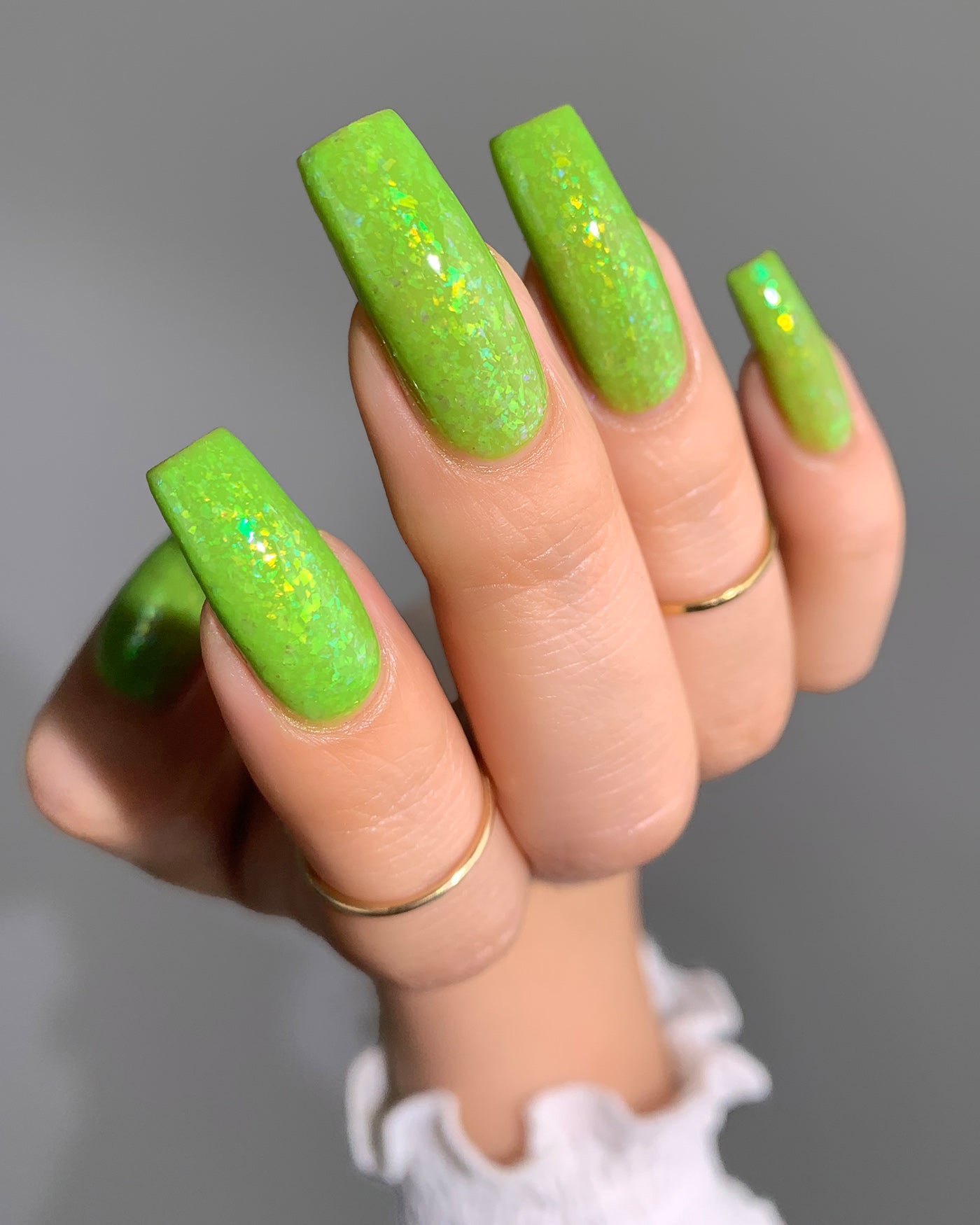 BEST BUD is a lime green jelly lacquer filled with turquoise and chartreuse iridescent flakies. its buildable formula can be layered to your liking, for either a semi-sheer or more opaque look. from the KALEIDOSCOPE HAZE SET.
