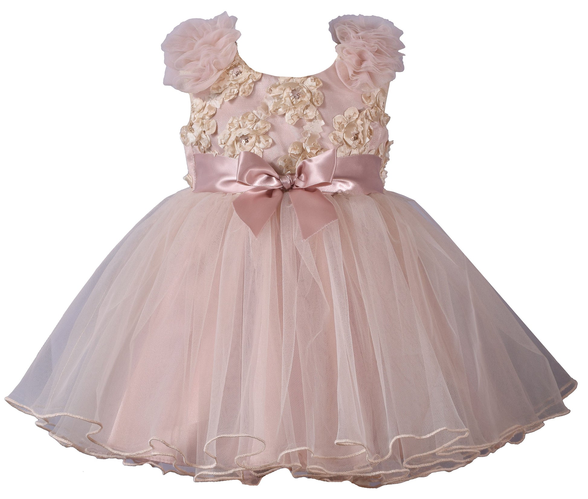 Seasonless sleeveless blush embroidered bodice dress with ballerina skirt and satin ribbon band and bow at waistline includes panty