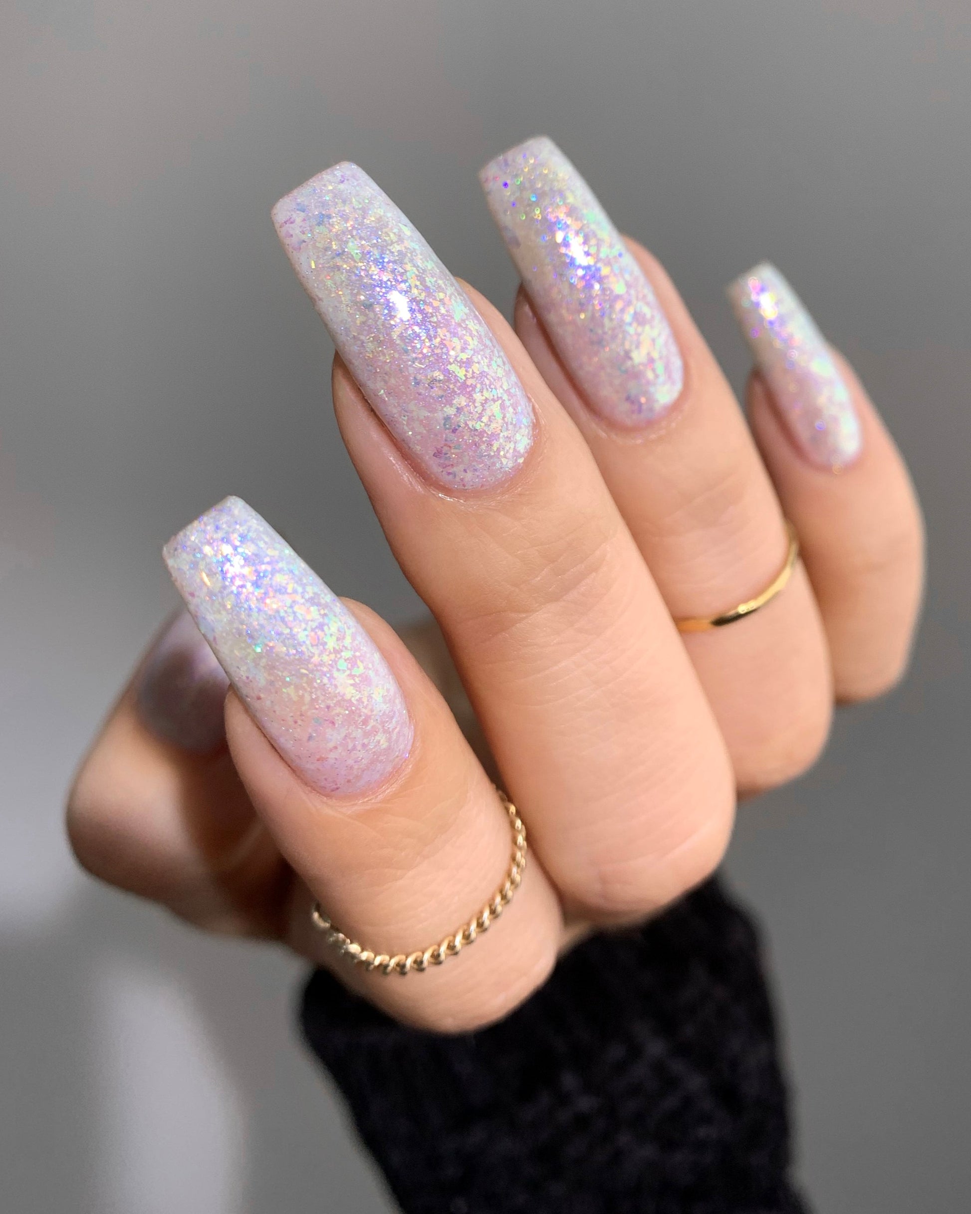 let your curiosities get the best of you. no wandering eye or racing mind is immune to the hypnotizing allure of this glistening white gem. as iridescent flakies flicker through a rainbow reef of glimmering marine shades and a cool wave of indigo shimmer washes over claws, it’ll leave you clutching your metaphoric pearls, positively transfixed.