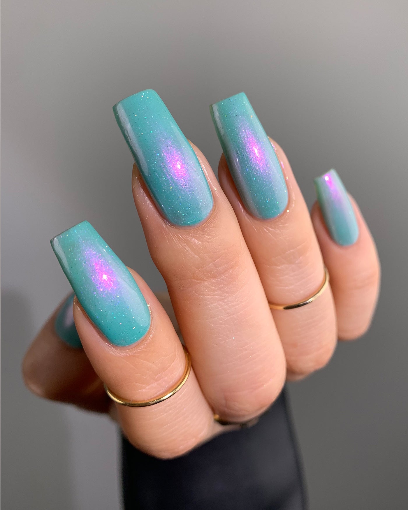 EARTH TO GAIA is a sheer jade green lacquer with pink shimmer and micro holographic glitter that looks most divine in the sun. from the GODDESS COMPLEX SET.