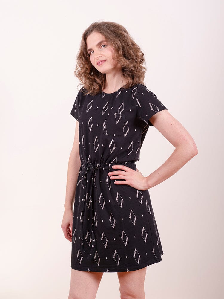 The Abby Diamond Vine Drawstring Dress is designed to be slightly roomy and is constructed with stretchy jersey cotton for a flexible fit. This organic cotton jersey makes for the perfect casual little black dress, and this geometric print adds fun to a classic black and white color combo. Adjust the drawstring for a loose tunic dress fit, or cinch the waist for something more defined.