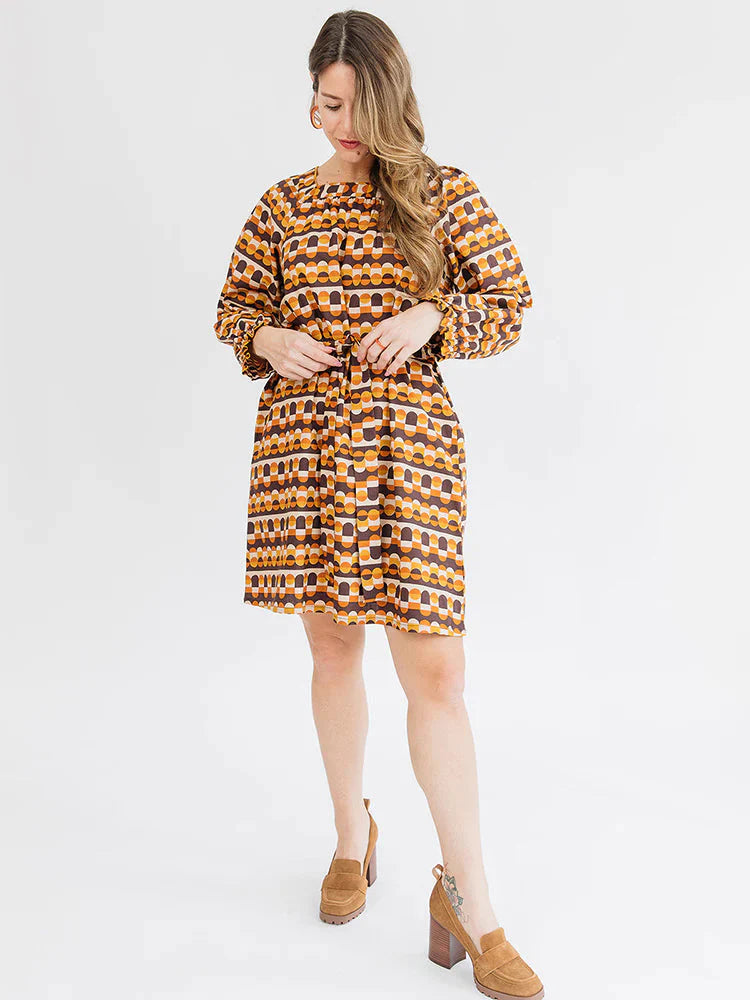 The Alexis returns for the season - this time as a long sleeve mini dress! Featuring hand screen printed fabric in a bold graphic pattern, subtle whip stitched embroidery on the neckline, and cute ruffle cuffs, this dress is big on style details. Adjust the removable belt for a defined waist, or omit it entirely for a throw-on-and-go shirt dress aesthetic. This mini hits above the knee, but long sleeves and an easy, loose fit make this a look anyone can pull off.
