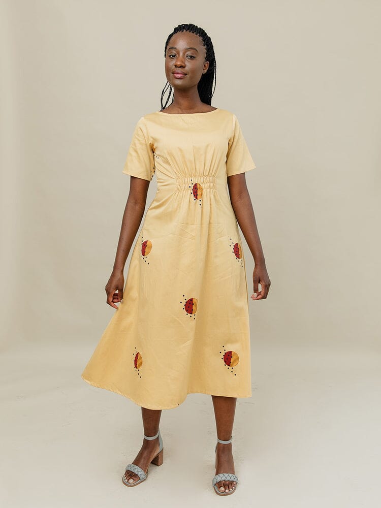 Your favorite midi dress has a new textile option this fall - super soft and luxe satin cotton! This gorgeous creamy yellow dress has a minimal graphic print that makes a statement, while still letting your personal style shine through. A Mata classic with the same fit you know and love, the Artsy Traveler Midi has elastic ruching at the front and back and gives comfortable stretch without zippers.