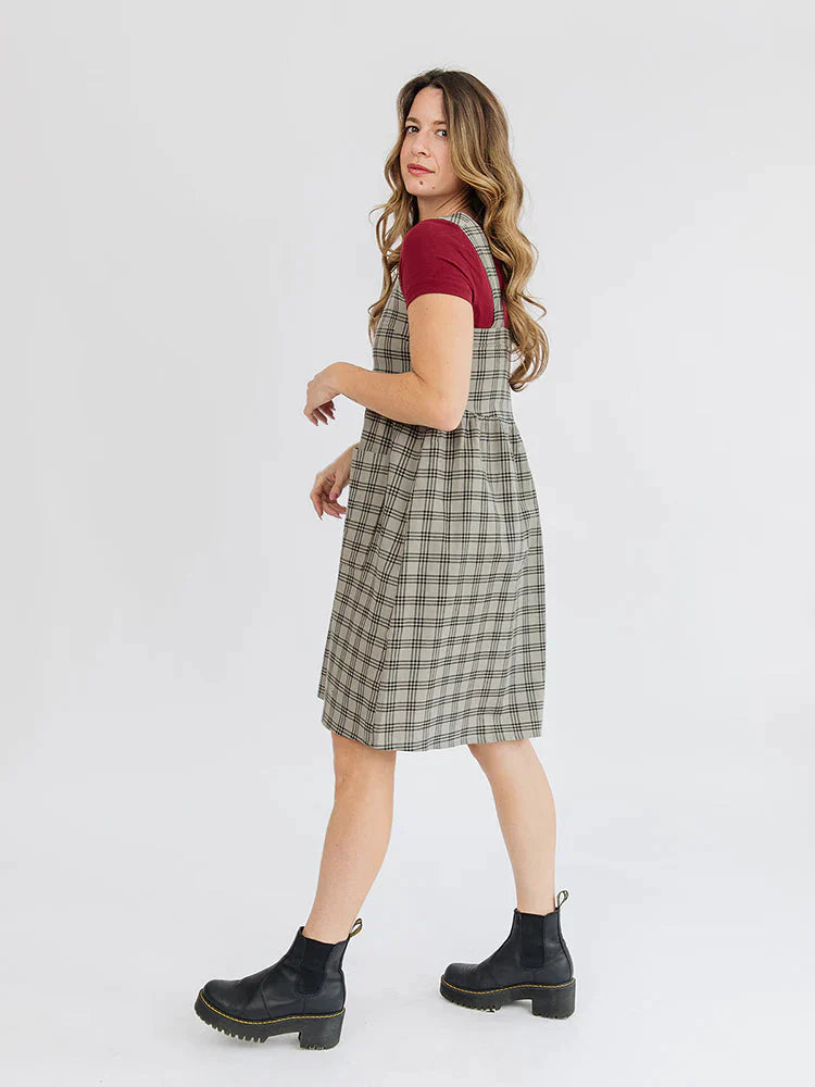 This apron dress is the on-trend piece you can make your own. Cut from custom cotton plaid weave, and featuring wide straps and roomy front patch pockets, wear Billie sleeveless or layer with your favorite tee to wear year-round.