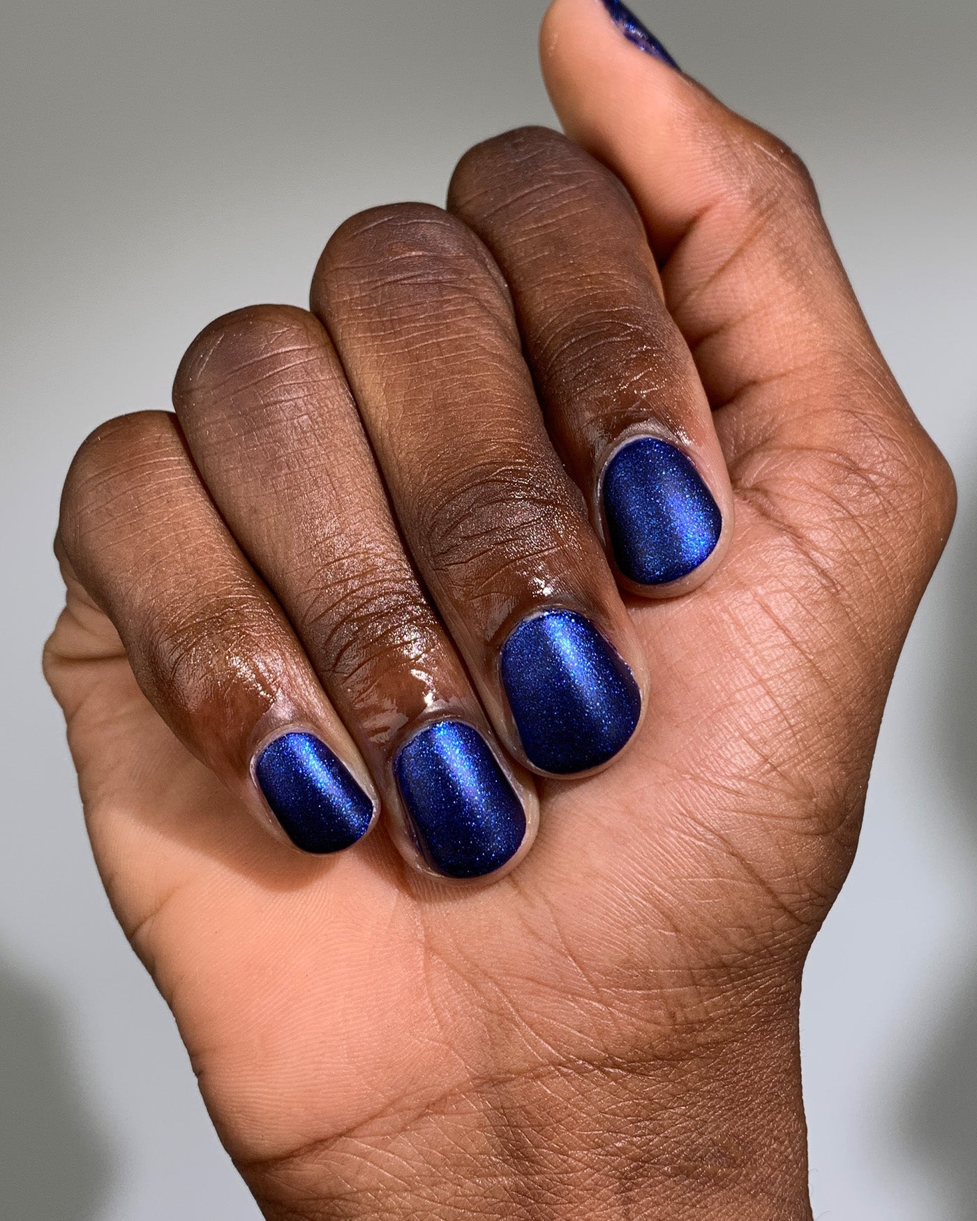 RUE MORGUE is a matte blue lacquer filled with red, violet, and blue shimmer.