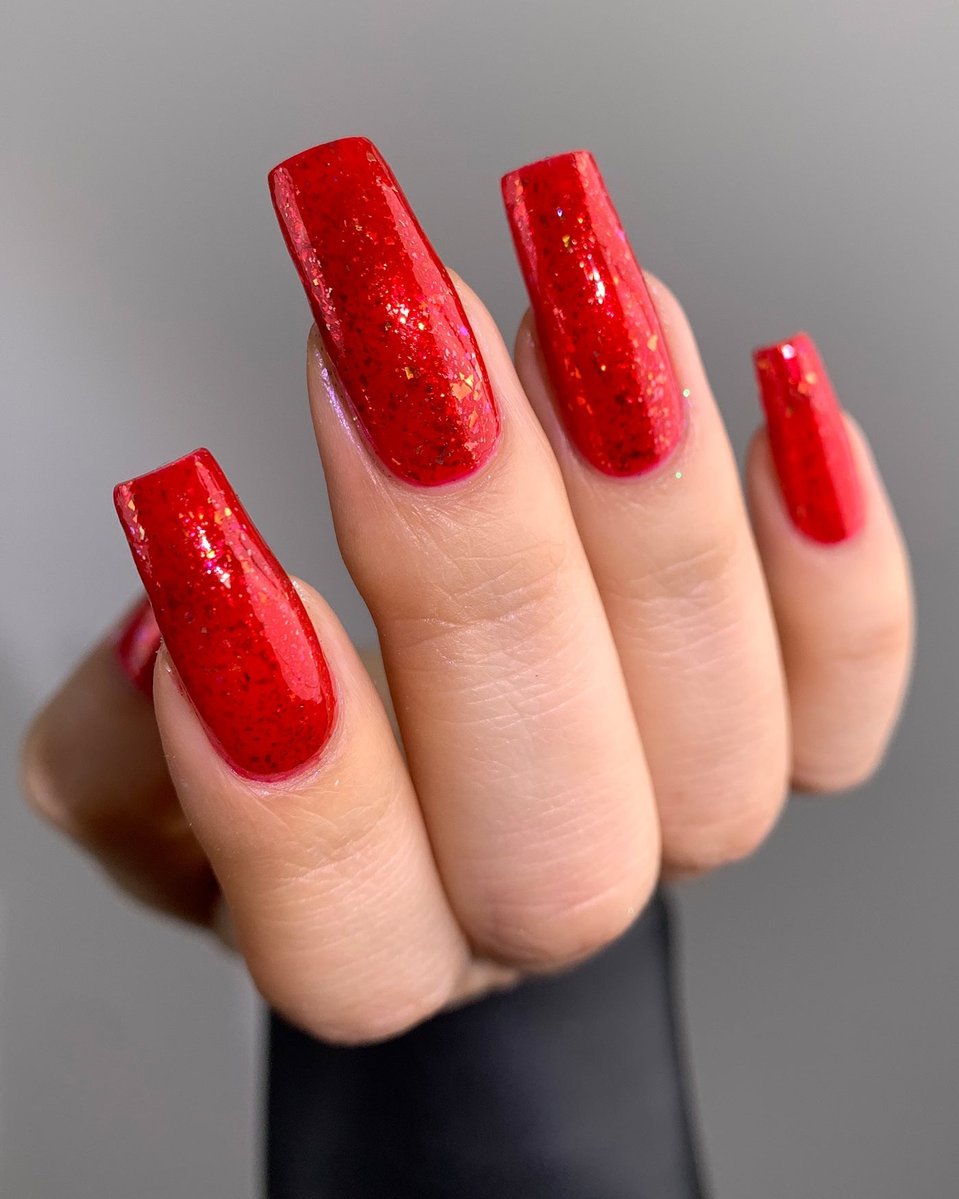 wanna take your claws on their own totally f a r o u t little journey? uncap this enchanted red jelly tincture and set your nails aglitter and aglow with bitty bits of holo glitter and magical multicolor flakies that twinkle like a teeny tiny kingdom of technicolor toadstools.