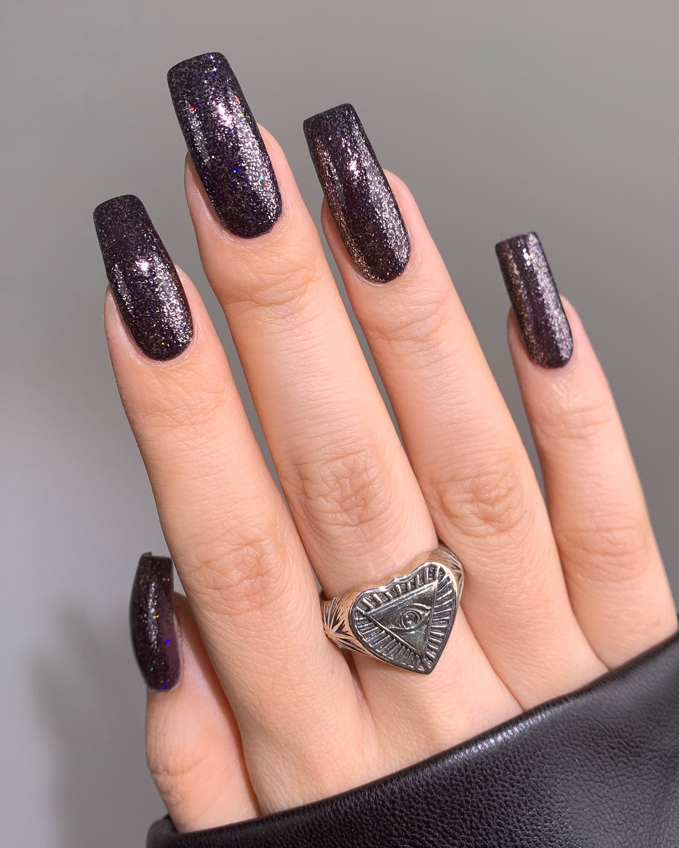 illuminate your inner darkness with this black metallic lacquer. glints of silvery luminescence create a powerful contrast against its blackest-black base.