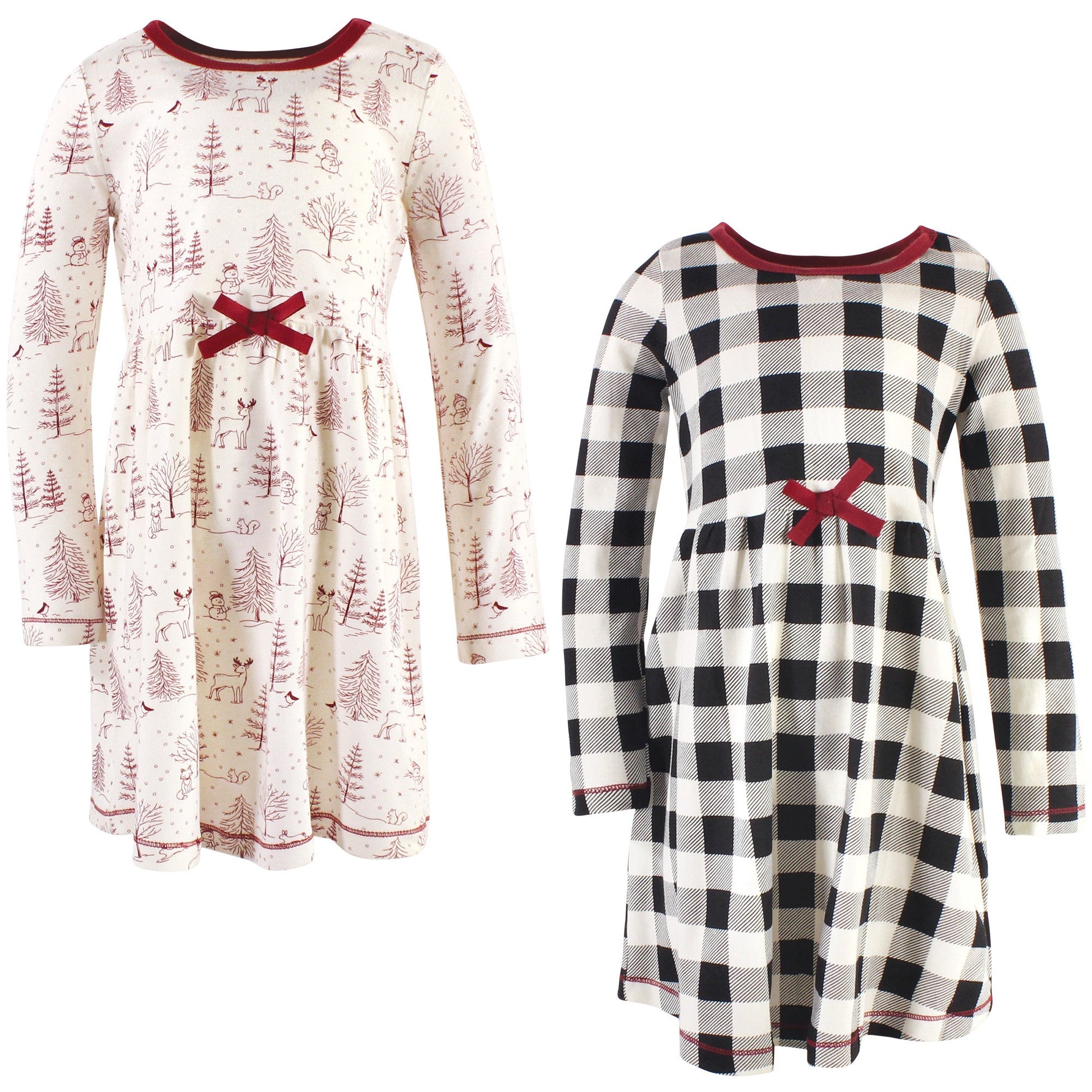 Touched by Nature Big Girls and Youth Organic Cotton Long-Sleeve Dresses 2-Pack, Winter Woodland