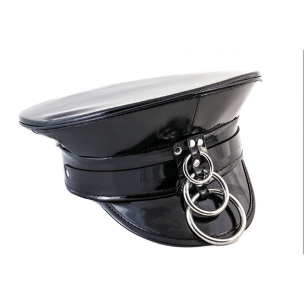 This patent leather hat from Funk Plus has the sexy sheen that everyone loves about patent leather, while still being very comfortable to wear for hours on end. There are three sturdy O-rings built into it that are attached firmly enough to handle a tug or three in a bondage-themed roleplay or cosplay setting.