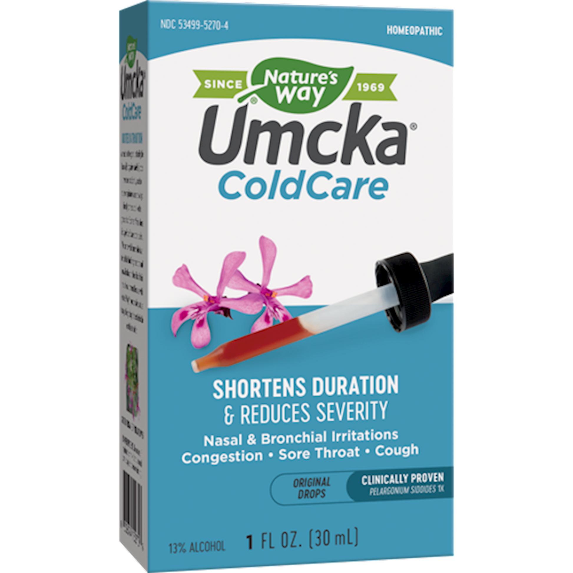 Homeopathic - Shortens the duration & reduces severity of common cold, nasal throat and bronchial irritations Why Umcka ColdCare The right extract addresses the cause Pelargonium sidoides 1X the main ingredient in Umcka ColdCare. That means youre getting a medicine that works safely with your body not against it. Why Umcka ColdCare Original Drops Convenient cold symptom relief in easy dosing form Umcka ColdCare Original Drops comes in a concentrated liquid form with droppers for convenient dosage. You can take it straight or add it to a beverage whatever is more convenient for you. Umcka ColdCare Drops are also available in a 99.9% alcohol-free formula for children ages 6 and up. Clinically proven You can feel confident knowing that Umcka (Pelargonium sidoides 1X) is proven effective in clinical studies for alleviating common cold symptoms, plus nasal, throat, and bronchial irritations.